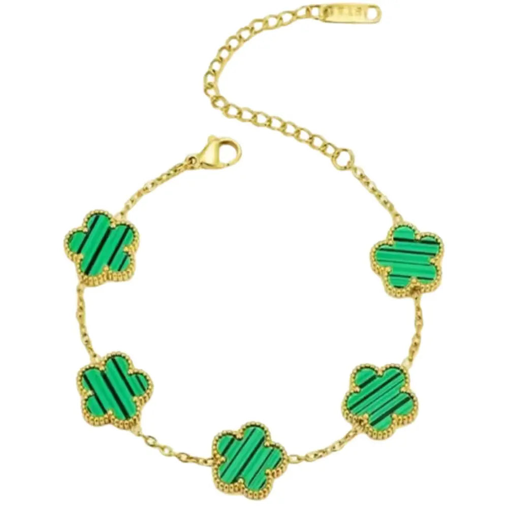 Ajoutez une touche de chance et d’élégance à votre collection de bijoux avec ce magnifique bracelet fleurs vert or. Conçu avec cinq pendentifs trèfle en acrylique vert, ce bracelet se distingue par son design délicat et sophistiqué. Chaque trèfle est soigneusement attaché à une chaîne dorée, offrant un contraste saisissant qui attire le regard. Que ce soit pour une sortie décontractée ou une occasion formelle, ce bracelet fleurs vert or saura compléter toutes vos tenues. Imaginez-le orner votre poignet, ajoutant ce petit plus à votre look et apportant une dose de fraîcheur et de charme.